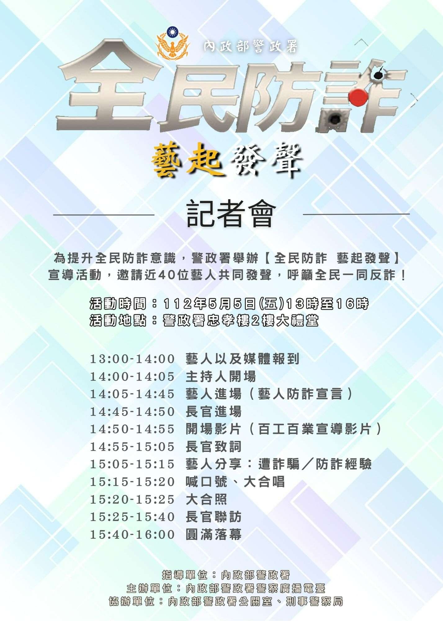 「全民防詐,藝起發聲」記 者會訂於112年5月5日13-16時在警政署舉行,請關注「NPA 署長室」或「CIB局長室」臉書直播,邀您全民反詐啟動日 一同防詐。