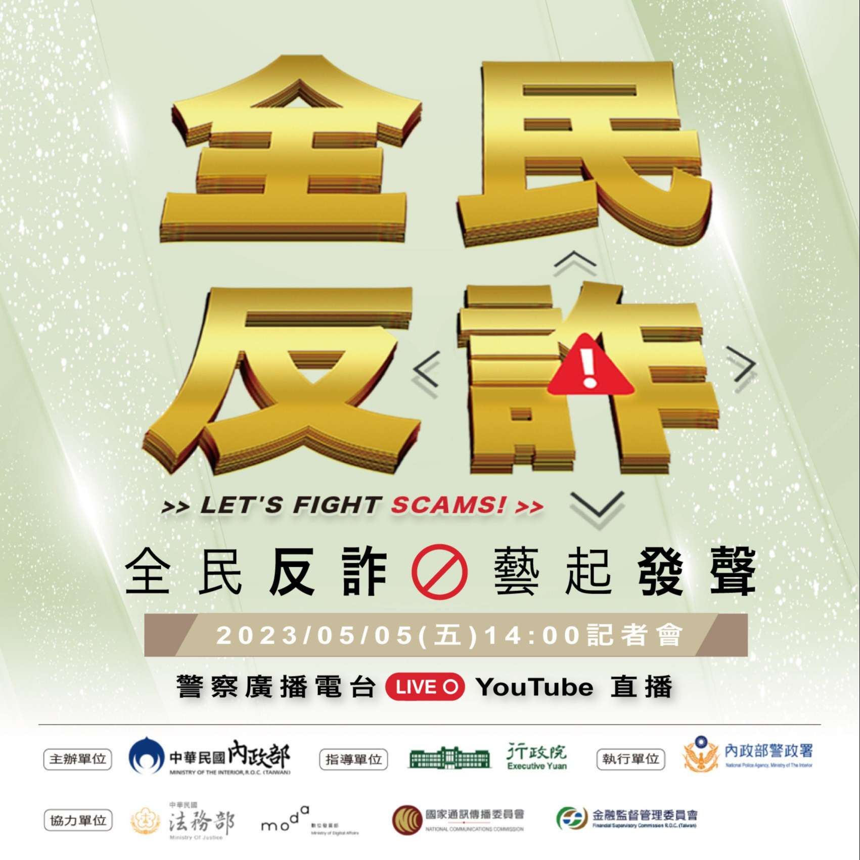 二、為使民眾對反詐議題產生共鳴,營造全民齊心反詐氛圍, 內政部定於112年5月5日14時至16時舉行「全民防詐藝起發 聲」記者會及「全民反詐日」擴大宣導活動,俾廣泛觸及 全民知悉。