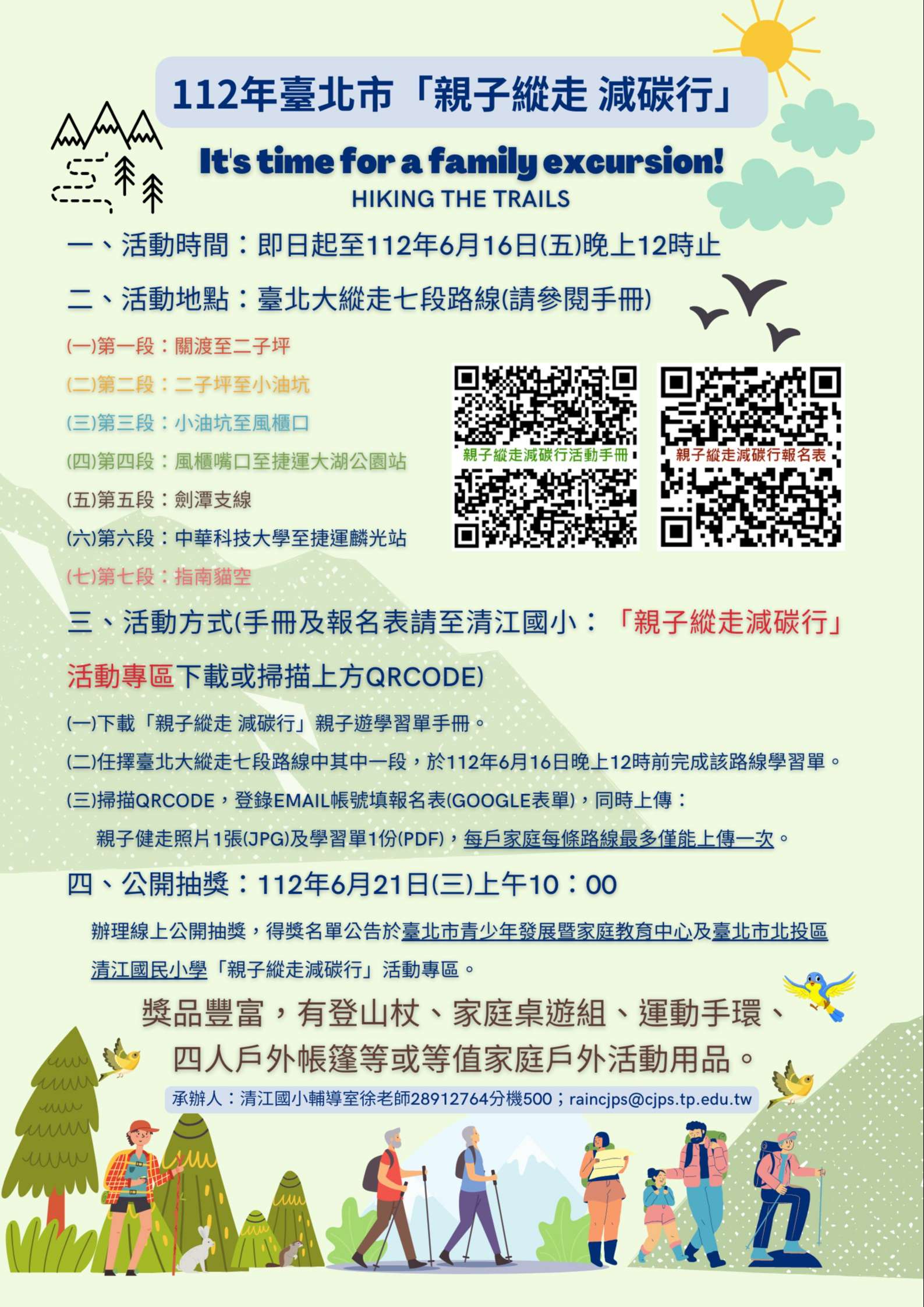 北市青少年發展暨家庭教育中 心網站及臺北市北投區清江國民小學「親子縱走減碳行」 活動專區。倘有疑義,請洽臺北市北投區清