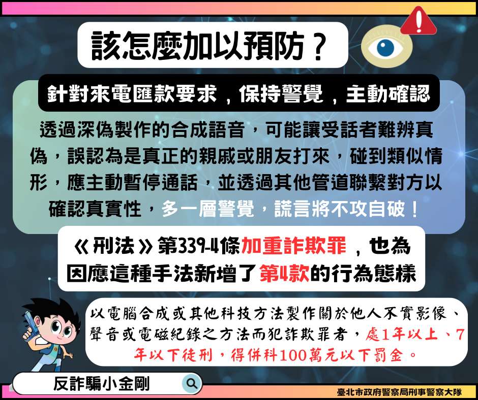 二、隨著人工智慧發展,「深僞(Deepfake)」技術恐遭有心 人士利用於假訊息、影片、語音等媒體素材合成製作,達 到「換臉、變聲」等效果,甚至用於強化詐欺手法的擬真 性,令民眾難辯真偽,因而受騙。