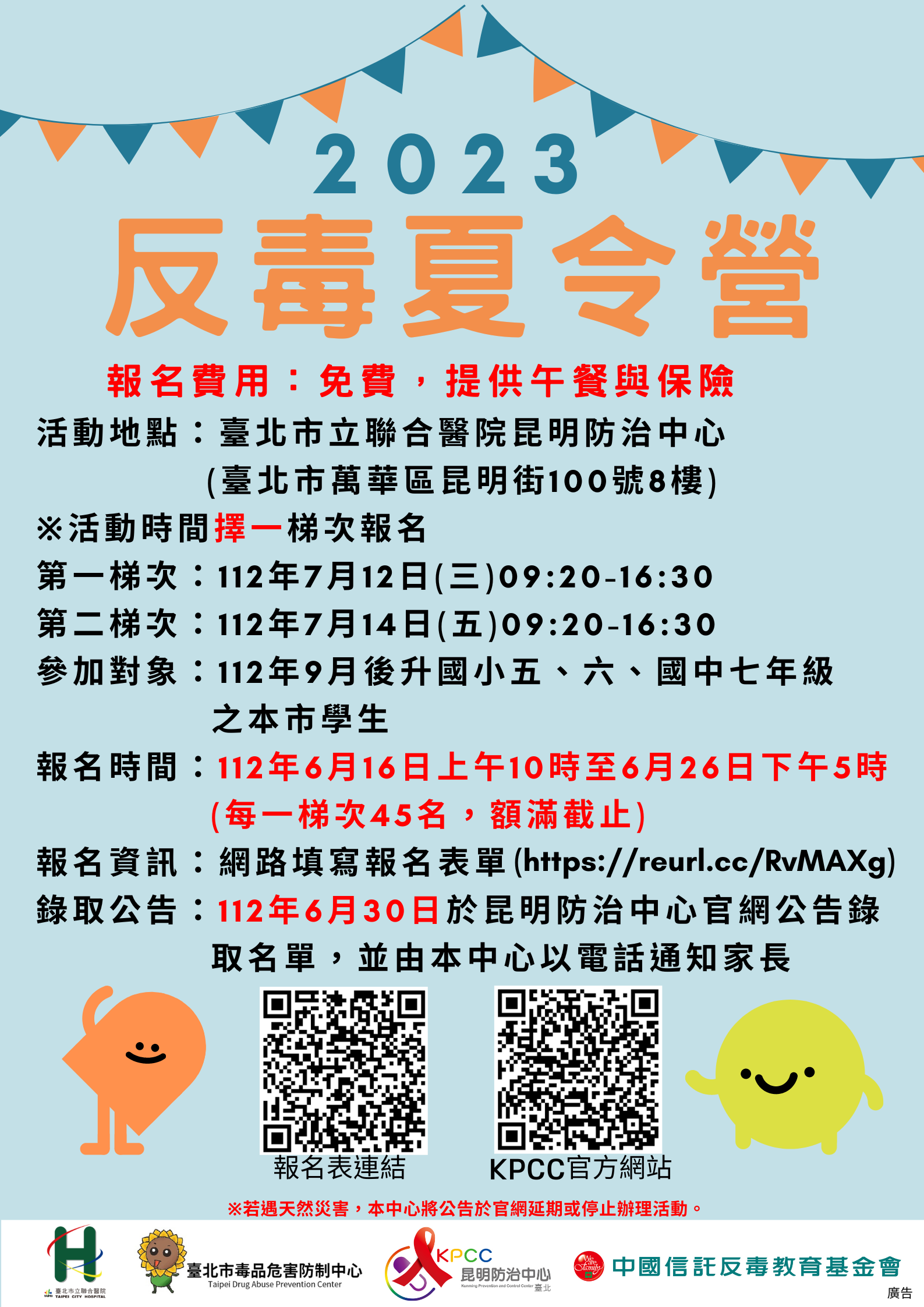 三、檢附營隊宣傳海報1份,惠請協助公告宣傳,報名資訊可至 昆明防治中心官網查詢(https://tpech.gov.taipei /mp109231)。