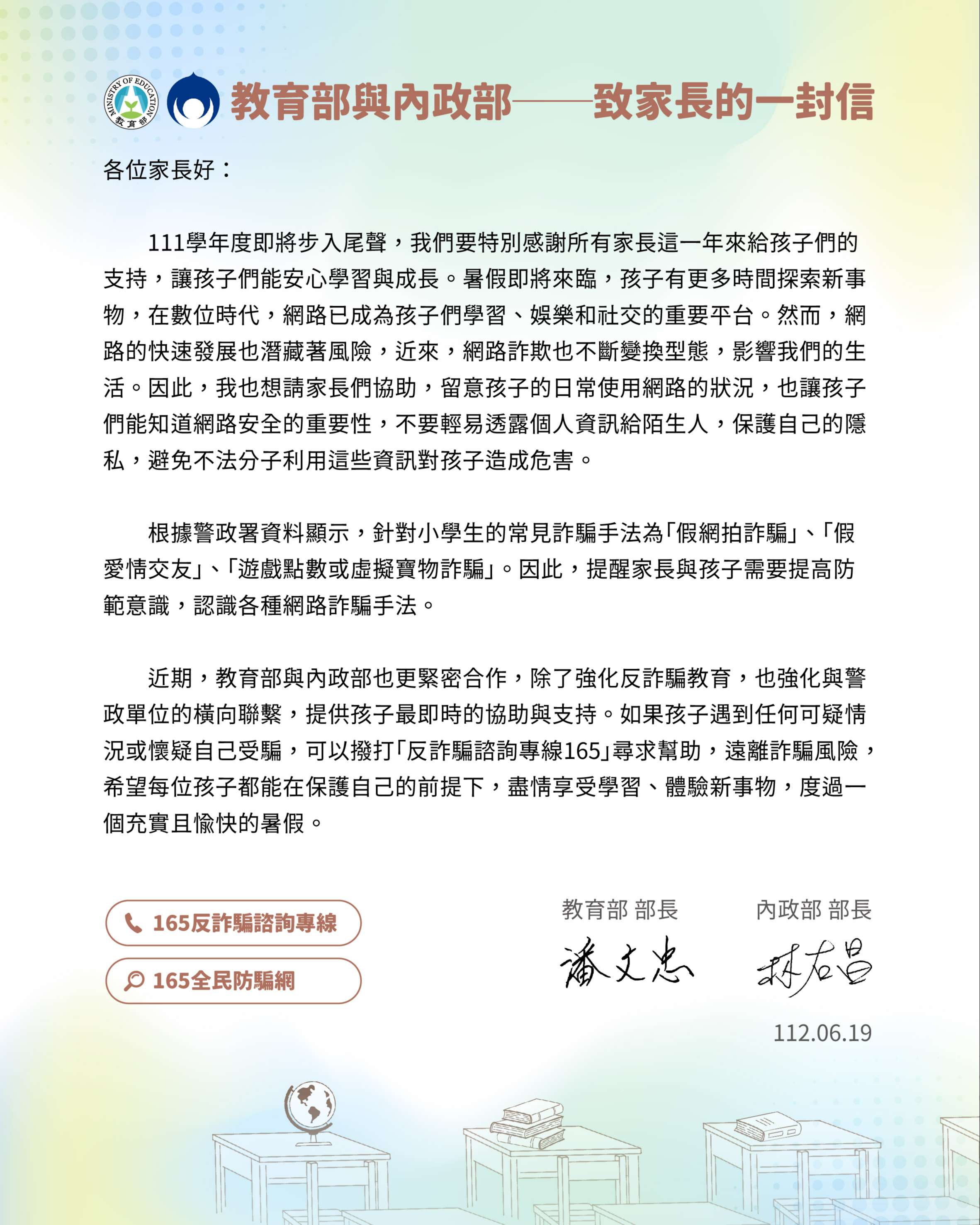 二、 為提升學生及家長之防詐免疫力,以預防近期各式不斷翻新的詐騙手法,教育部與內政部跨部會合作,區分不同年齡教育階段分別製作「教育部與內政部-致家長的一封信」(含反詐騙圖卡)國高中版及國小版各1份,以整體性提升學生及家長識詐之能力,避免成為詐騙受害者。