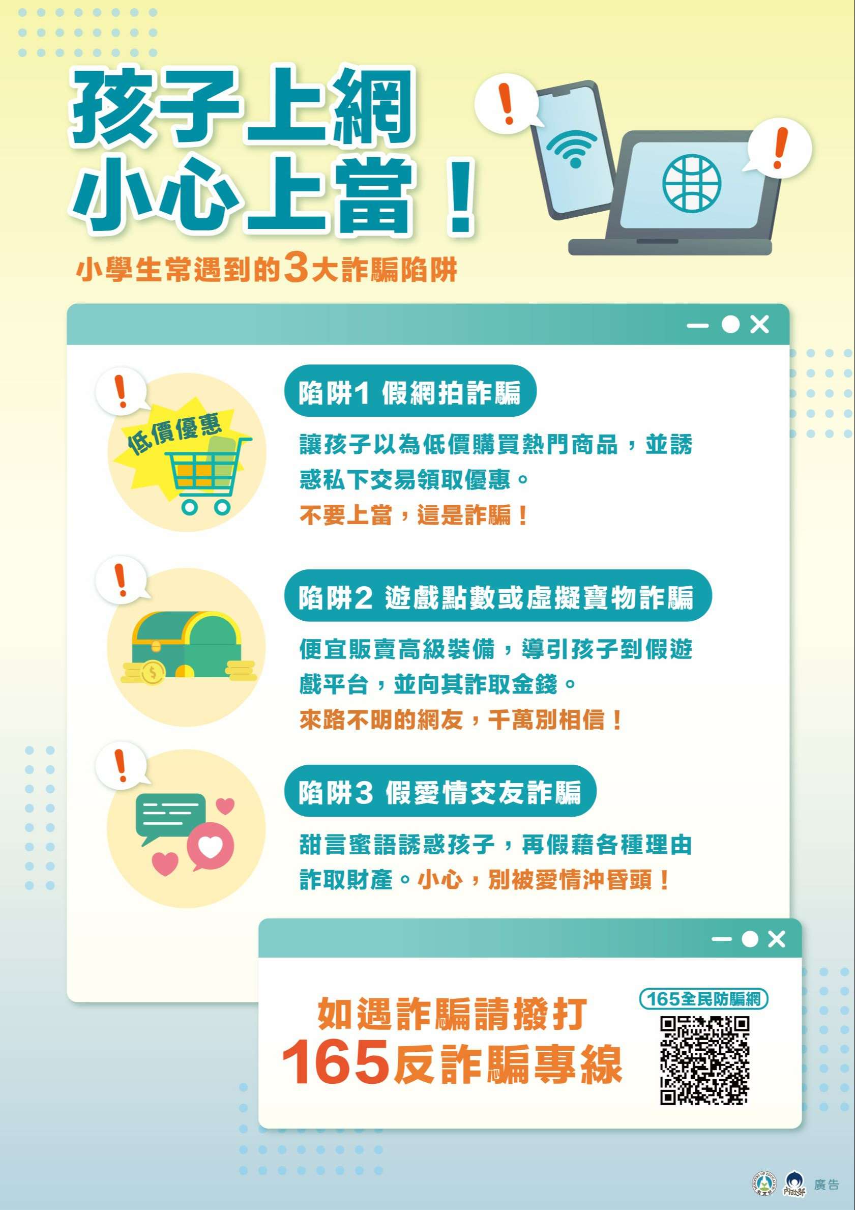 三、 請各校透過群組、公告等電子通訊或其他多元管道對學生及家長宣導反詐騙相關作為