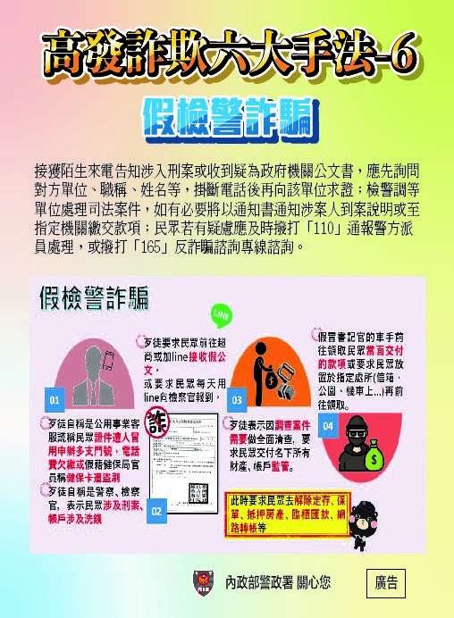 二、本案影片檔總計10部,Google雲端連結9部,youtube連結1 部(如附件1),宣導圖文6張(如附件2至7),推播期程 為1個月,提升國人防詐免疫 力。