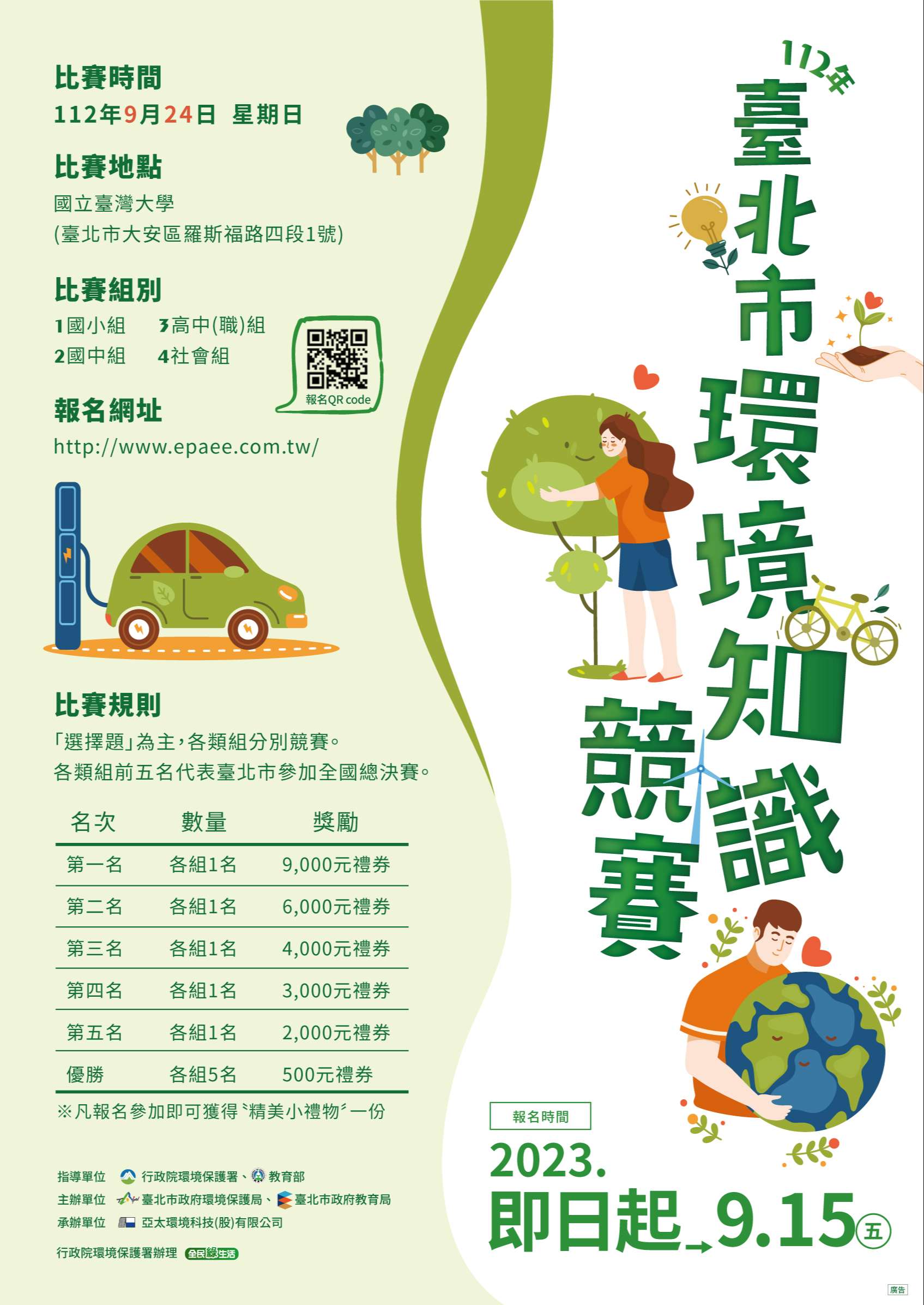 一、本市初賽報名日期至112年9月15日止,一律採網路報名, 有意參加者請至活動官網(http://www.epaee.com.tw/) 登記報名。