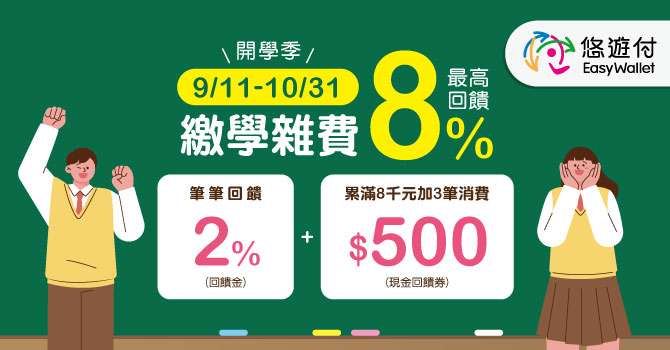 二、家長透過簡易步驟即可完成悠遊付親子綁定 (https://reurl.cc/QWAyNo),為鼓勵家長使用無現金繳費服務,悠遊卡公司亦提供相關獎勵活動,內容如下: (一)活動期間:112年9月11日至10月31日。(二)活動內容:活動期間當月使用悠遊付每筆扣款享2%悠遊付回饋金,另累積消費新臺幣(以下同)8,000元加3筆 消費即回饋500元現金回饋券,活動期間每戶最高回饋8% 悠遊付回饋金(或回饋券)。