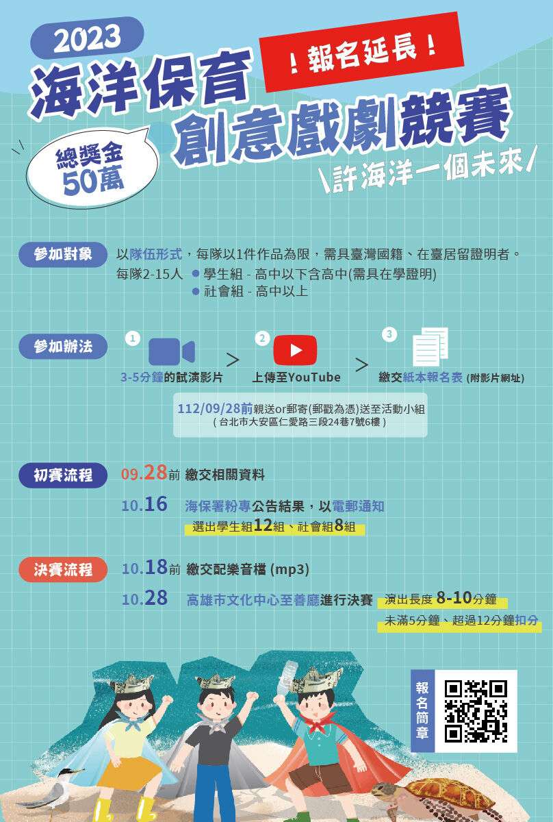 二、為擴大推廣海洋保育教育,該署112年度舉辦旨揭競賽活動,並邀請教育部、文化部及農業部擔任指導單位,期望透過不同領域國人共襄盛舉,發揮創意思維,以多元形式演繹如何「許海洋一個未來」,歡迎組隊報名參加競賽。