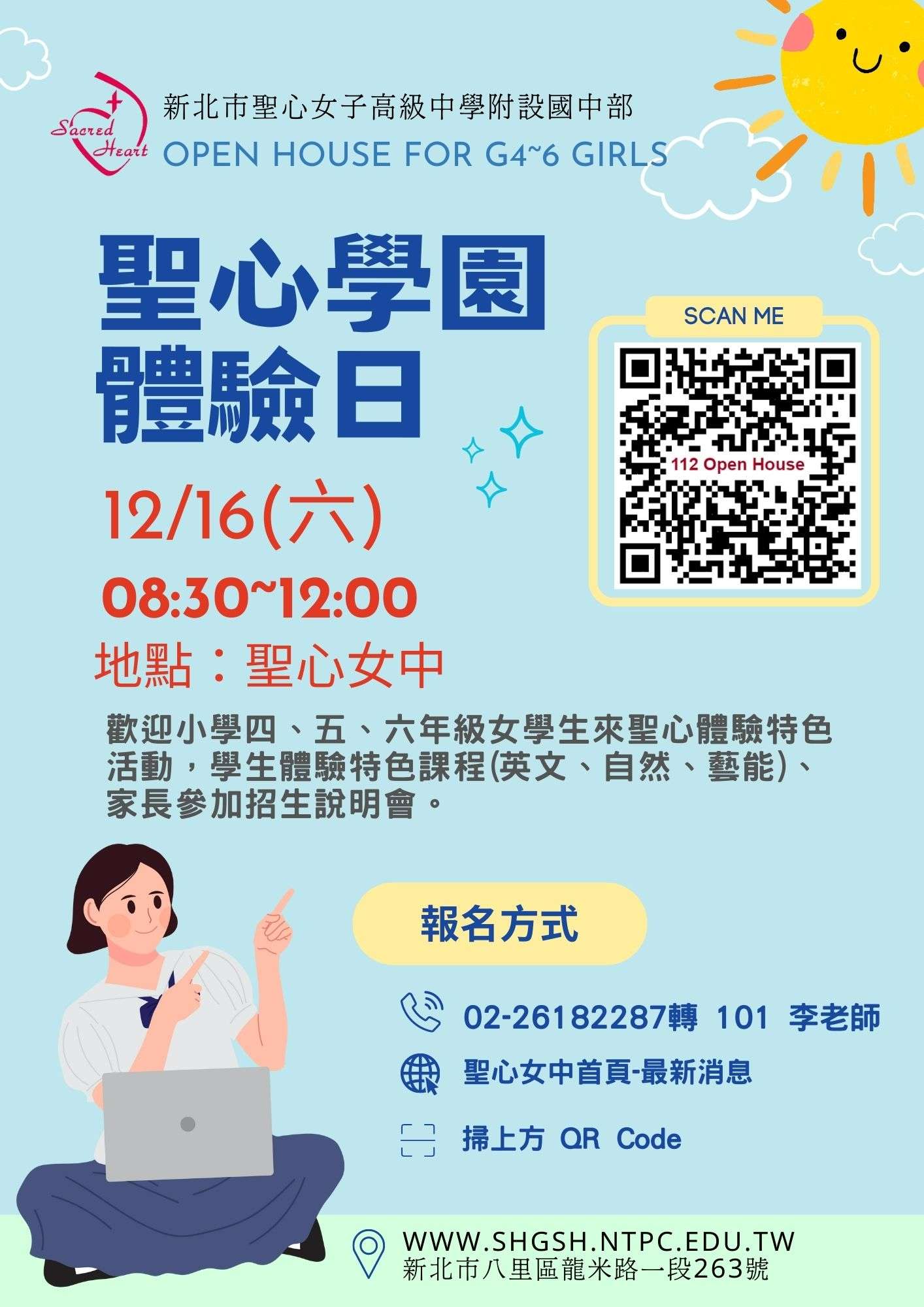 說明: 一、時間:112年12月16日(週六)上午8:30~12:10 二、對象:小學四、五、六年級女學生及家長 三、報名方式: (一) 報名表連結:https://reurl.cc/gaRNzR (二) 或至聖心女中首頁www.shgsh.ntpc.edu.tw—最新消息 報名。 四、聯絡人:李老師02-26182287轉101 五、附件:檢附活動實施計畫及海報,請惠予公告。