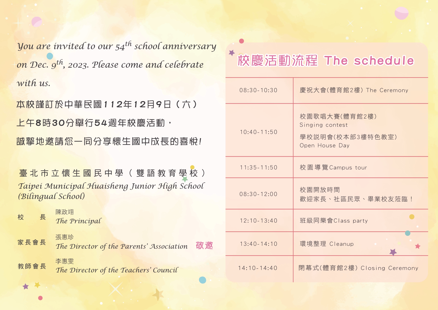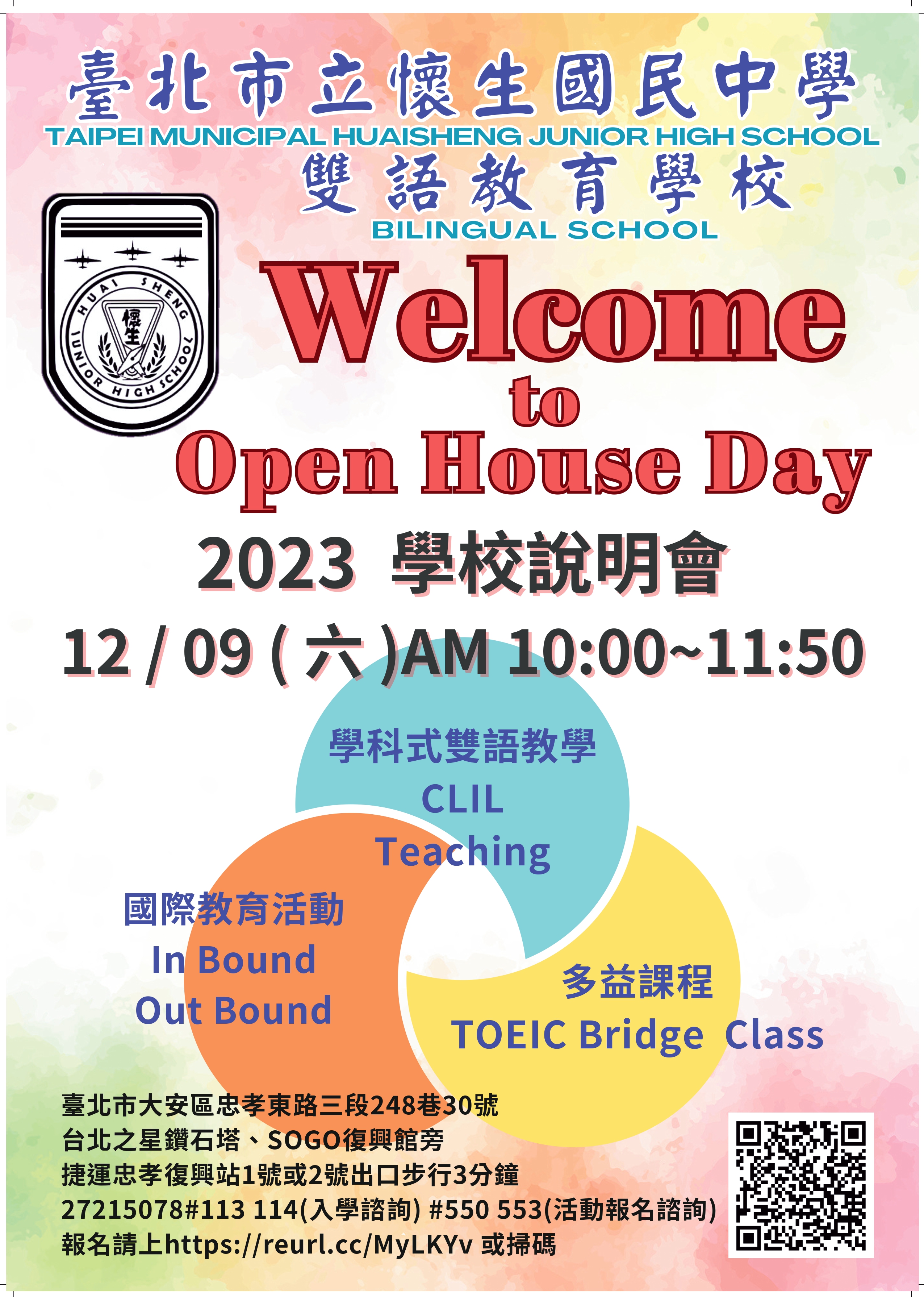 一、懷生國中自109學年度升格為雙語教育學校,辦理校園開放參觀日(Open House Day),提供國小應屆畢業生及家長,了解本校辦學理念、各項特色課程及學校教學環境。今年配合54 週年校慶擴大辦理,邀請蒞臨參觀。