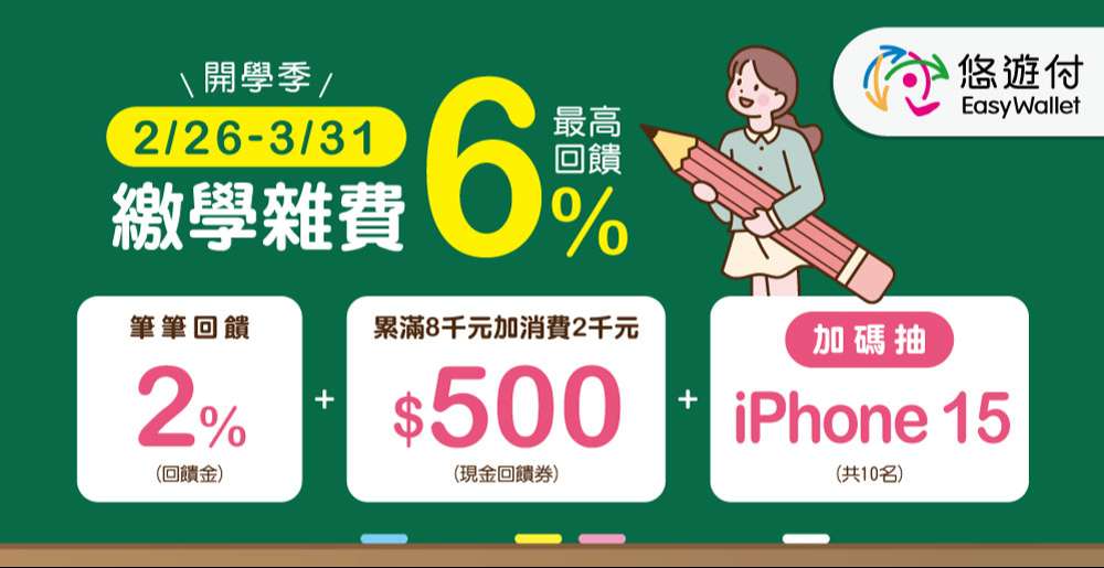 (二)活動內容:活動期間當月使用悠遊付每筆扣款享2%(限量,每戶回饋上限100元)悠遊付回饋金,另累積消費新臺幣(以下同)8,000元加消費扣款滿2,000元即回饋500 元指定通路現金回饋券,活動期間每戶最高回饋6%悠遊 付回饋金(或回饋券)。