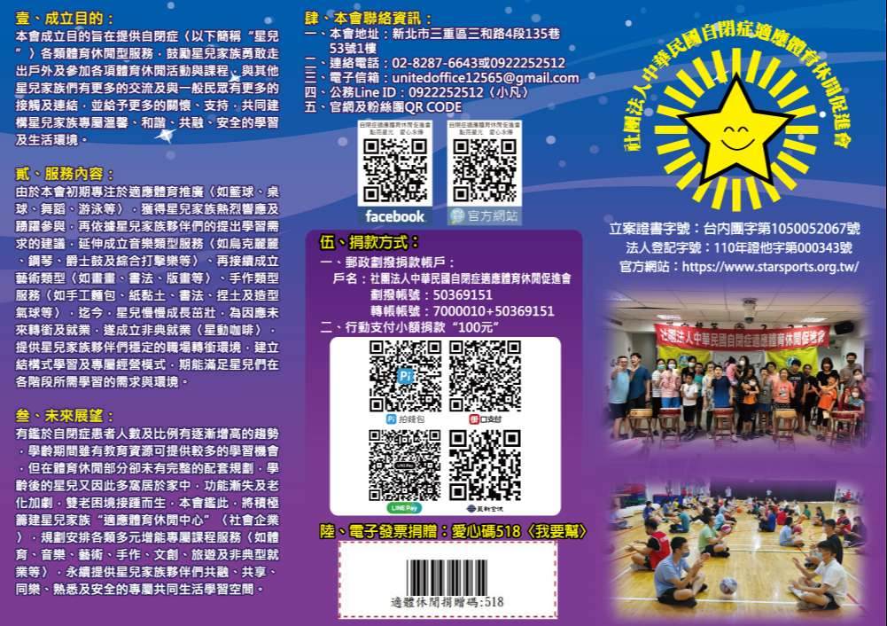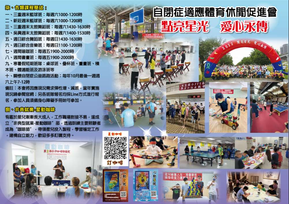 二、本會長期致力於自閉症者〈以下簡稱“星兒”〉各項體育 〈籃球、桌球、水適能、舞蹈等〉及休閒〈藝術創作、音 樂培養、手作工藝等〉等服務,期能提供星兒家庭專屬合 適的學習環境,不斷成長〈簡介單張如附件〉。
