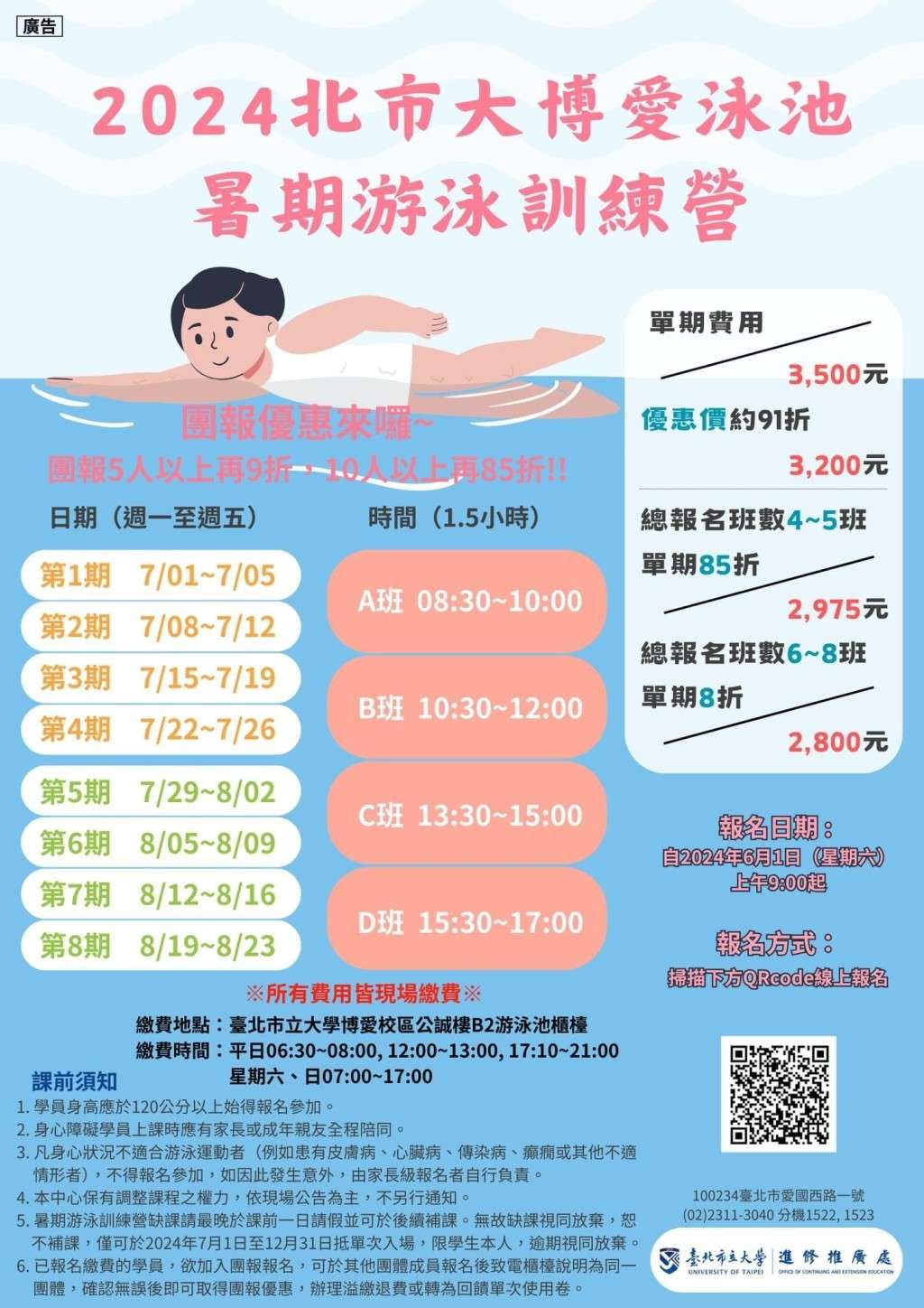 二、本校博愛校區泳池環境優良、設備完善、師資專業,請惠予轉知校內同學及家長,歡迎前來報名參加泳訓班。線上報名頁面連結:https://cee.utaipei.edu.tw/course/164 。