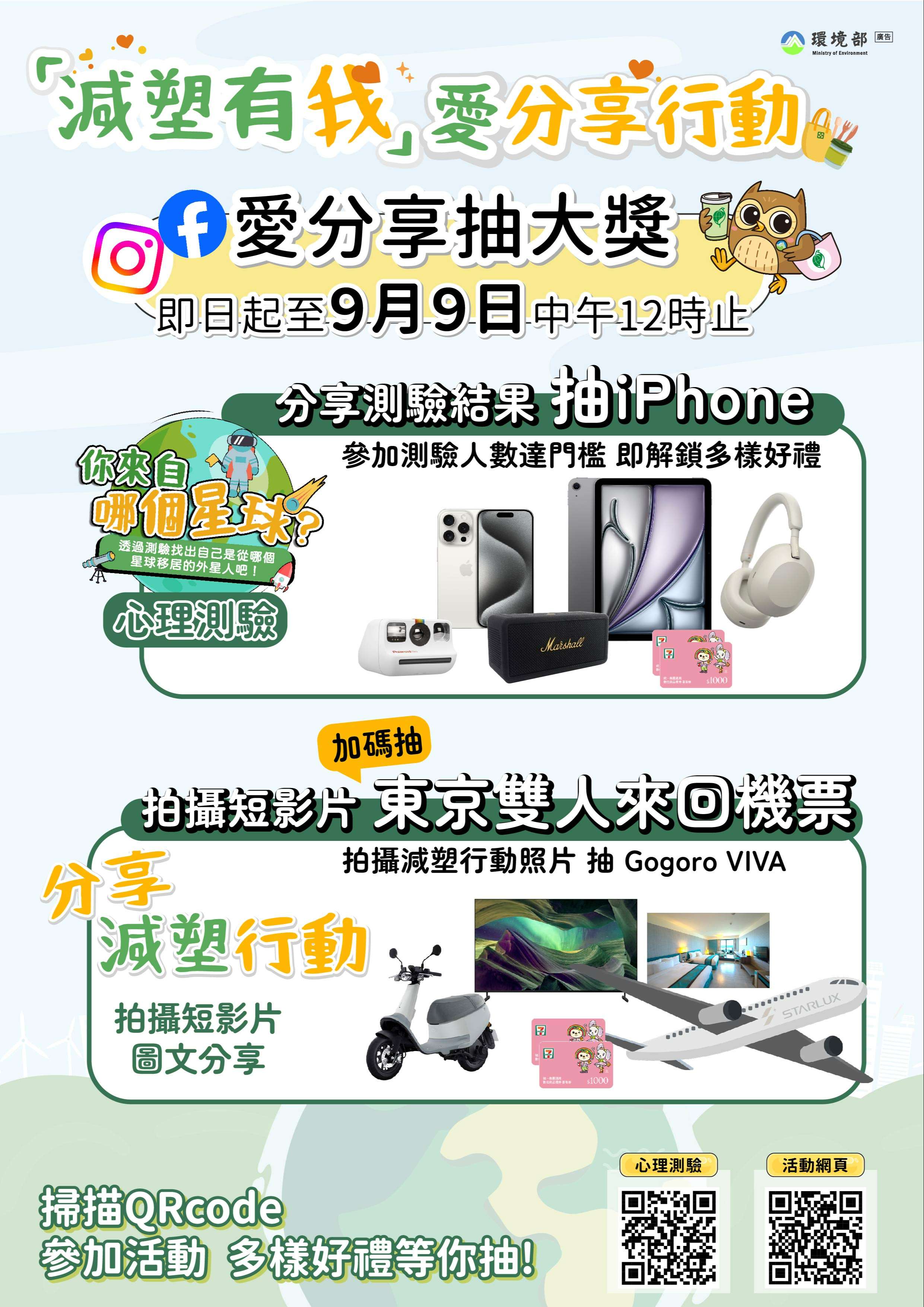 二、環境部為鼓勵社會大眾及莘莘學子在暑期假期間一起跟上全球減少塑膠的風潮,特辦理「減塑有我」愛分享行動,