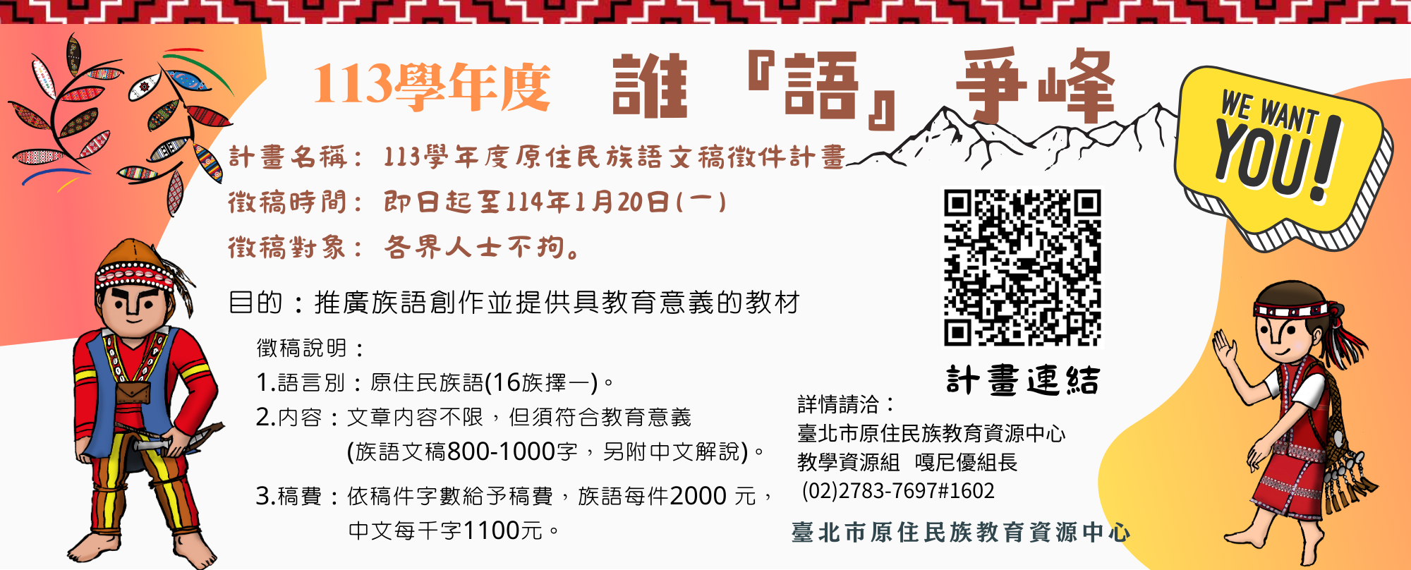(四)徵稿說明: 1、語言別:原住民族語(16族擇一)。 2、內容:文章內容不限,但須符合教育意義(族語文稿 800-1000字,另附中文解說)。