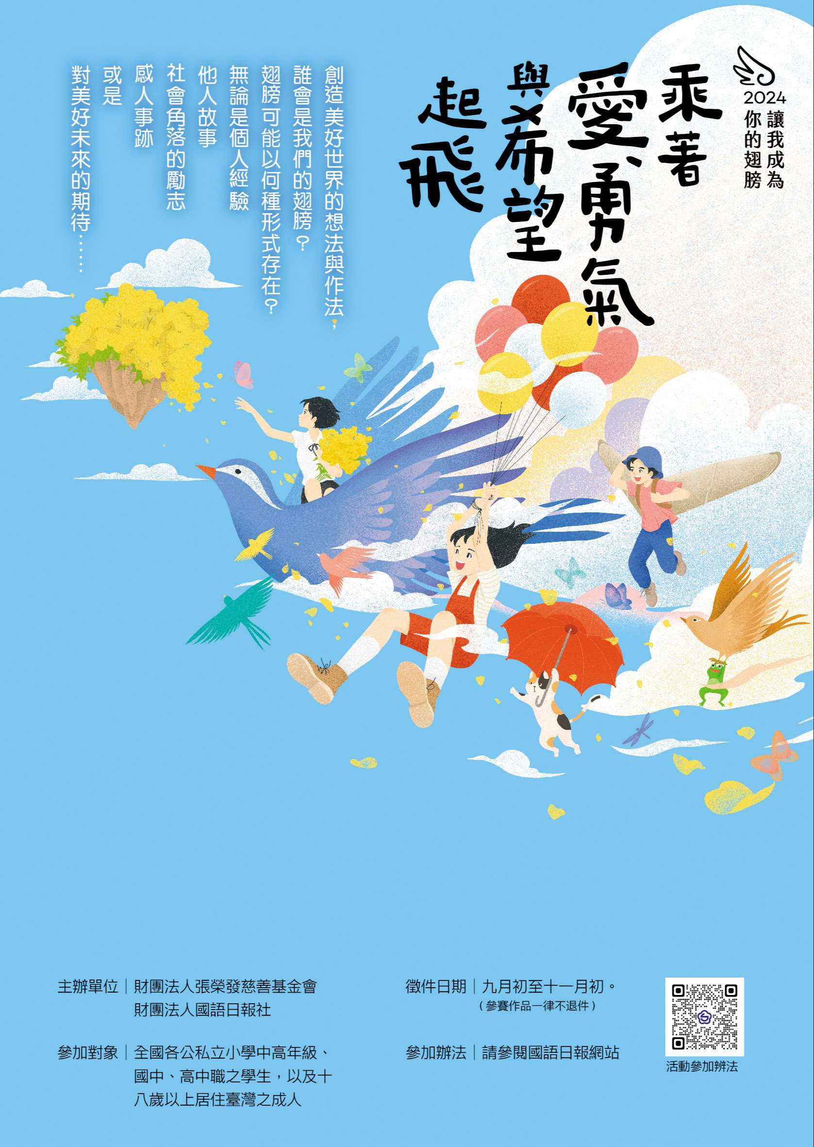 一、為了鼓勵正面助人的精神,強調社會連結與人際支持的重要,財團法人國語日報社與張榮發慈善基金會合辦「2024讓我成為你的翅 膀──乘著愛、勇氣與希望起飛」徵件活動。