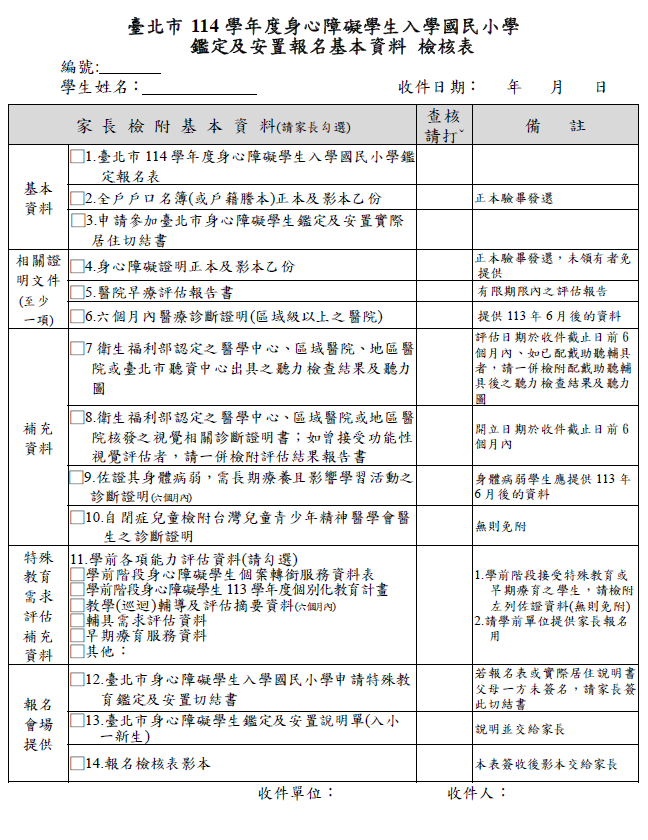 (二)全戶戶口名簿正本(含詳細記事、正本驗畢發還)及影本1份、申請參加臺北市身心障礙學生鑑定及安置實際居住說明書。
