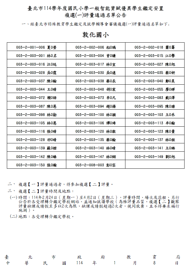 ◎ 學生及家長可至「臺北市國民小學一般智能資優學生鑑定安置系統」(https://www.gtide.tp.edu.tw)查詢成績、下載評量結果通知,相關操作方式及流程,詳見【成績查詢三步驟(複選一)】(如附件)。
