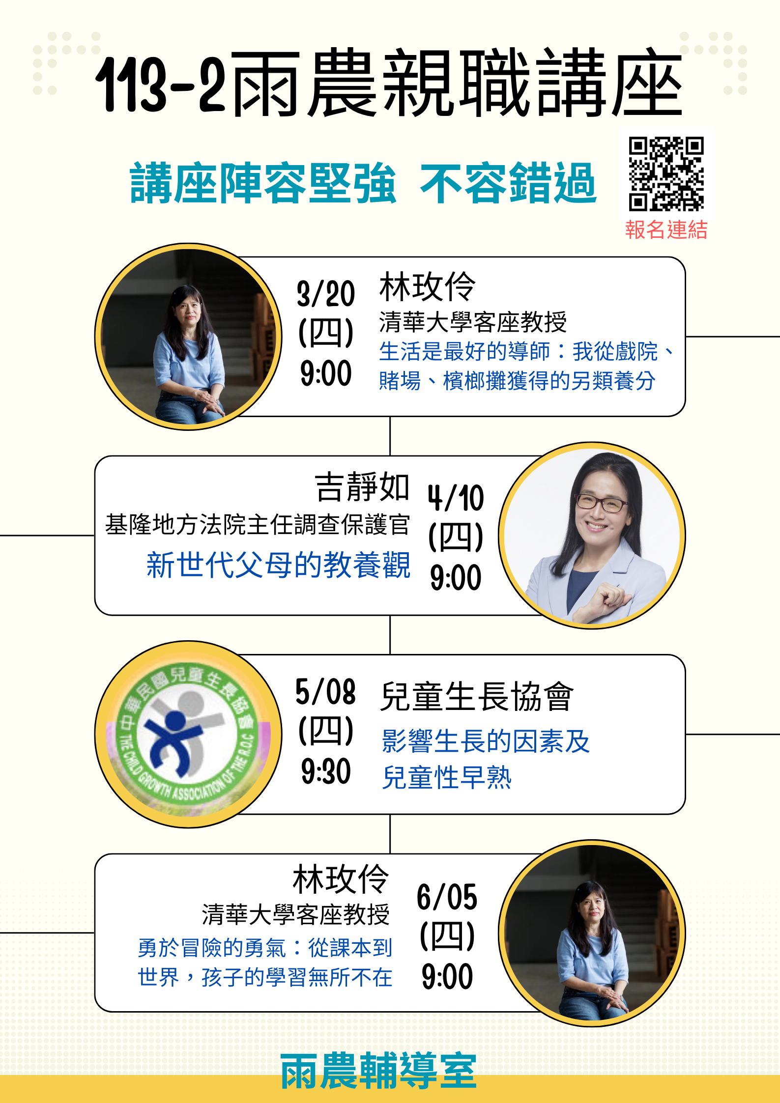 (四)6/5(四)9:00-11:30 林玫伶清大客座教授講題:「勇於冒險的勇氣:從課本到世界,孩子的學習無所不在」。