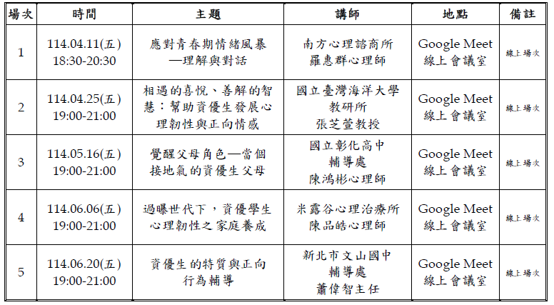 臺北市113學年度第2學期系列資優生家長親職講座內容與場次如下,相關報名方式等資訊詳見實施計畫(附件檔案)。