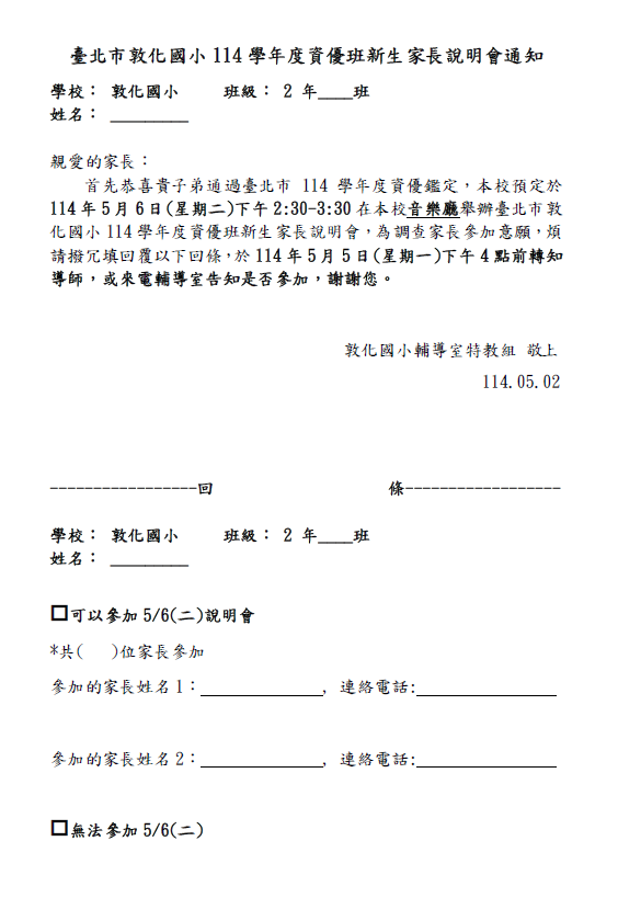 恭喜貴子弟通過臺北市114學年度資優鑑定,本校預定於114年5月6日(星期二)下午2:30-3:30在本校音樂廳舉辦臺北市敦化國小114學年度資優班新生家長說明會,請您於5月5日(一)前告知導師,或來電輔導室特教組27414065*153回覆是否參加。謝謝您