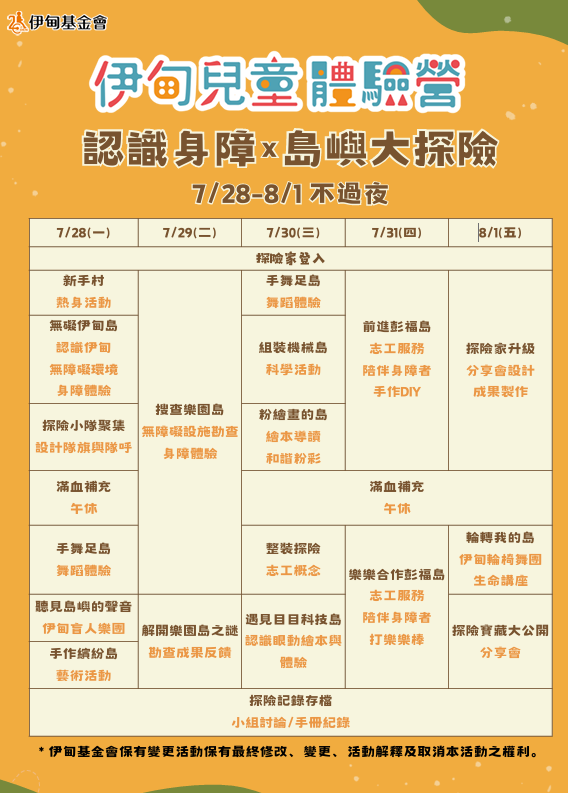 一、活動說明:伊甸兒童體驗營,是以「認識身心障礙」為主軸的營隊,包含小小志工體驗、科學活動、兒童樂園身障體驗闖關...等豐富的探險活動,訓練孩子的團隊合作力, 學習換位思考,培養同理心。