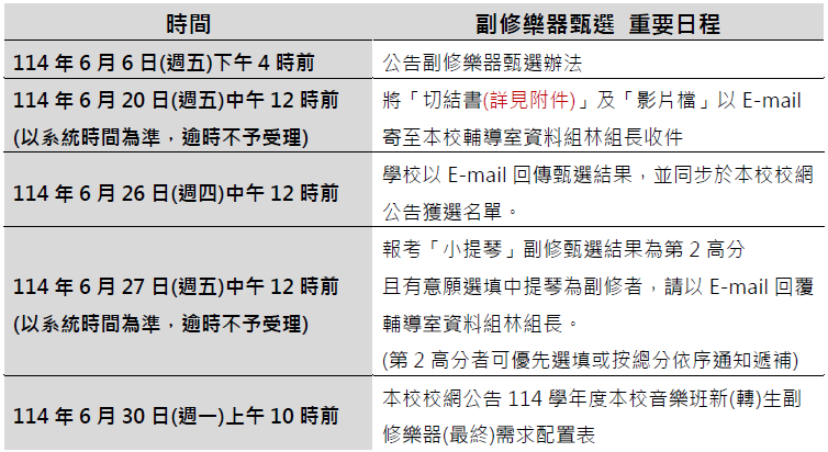 6. 中提琴副修甄選獲選名單確認後將最晚於114年6月30日(週一)上午10點前於本校校網公告114學年度本校音樂班新(轉)生副修樂器(最終)需求配置表。