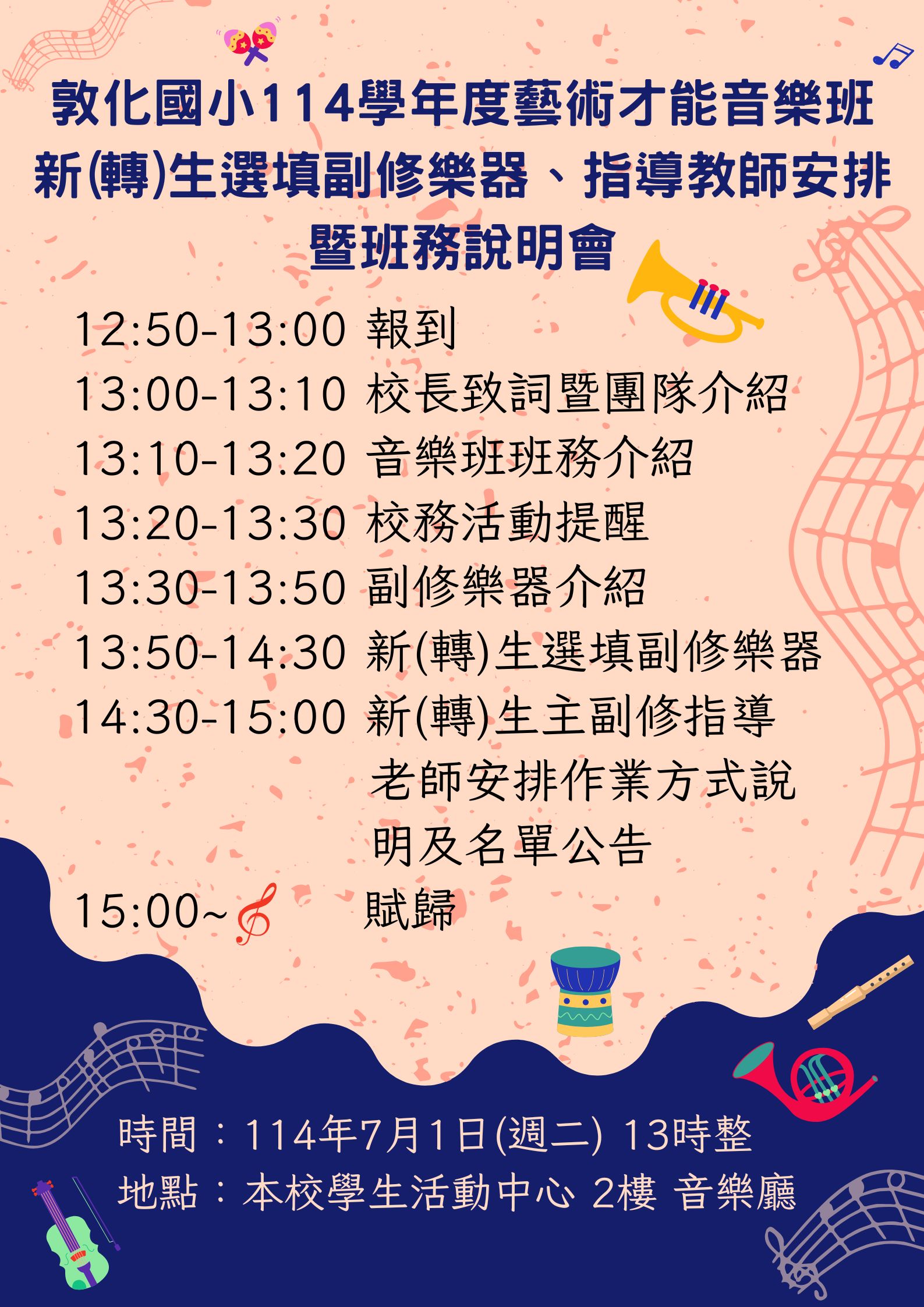 本校114學年度藝術才能音樂班新(轉)生選填副修樂器、指導教師安排暨班務說明會