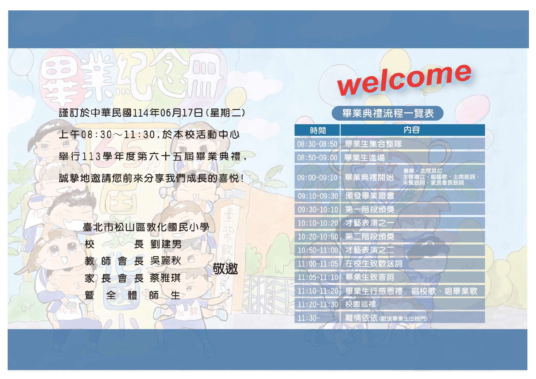 本校訂於114年6月17日上午8點30分起至中午11點30分,於本校活動中心辦理第65屆畢業典禮,敬邀6年級畢業生家長參加
