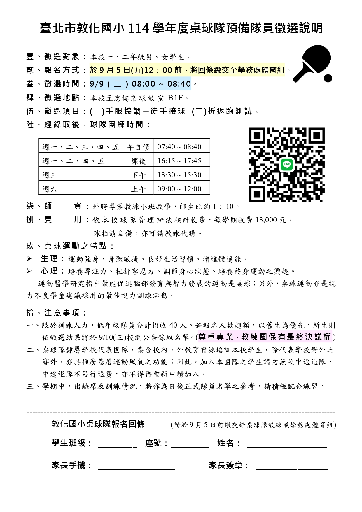 114學年度校團隊招募將於9月1日(一)新生家長座談會同步辦理宣傳及設攤說明