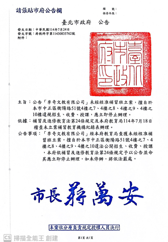 二、「李奇英文」(李奇文教有限公司)經本局查獲未經核准補習班立案,擅自於本市中正區衡陽路51號4樓之7、4樓之 8、4樓之9、4樓之10樓違法招生、收費、授課,