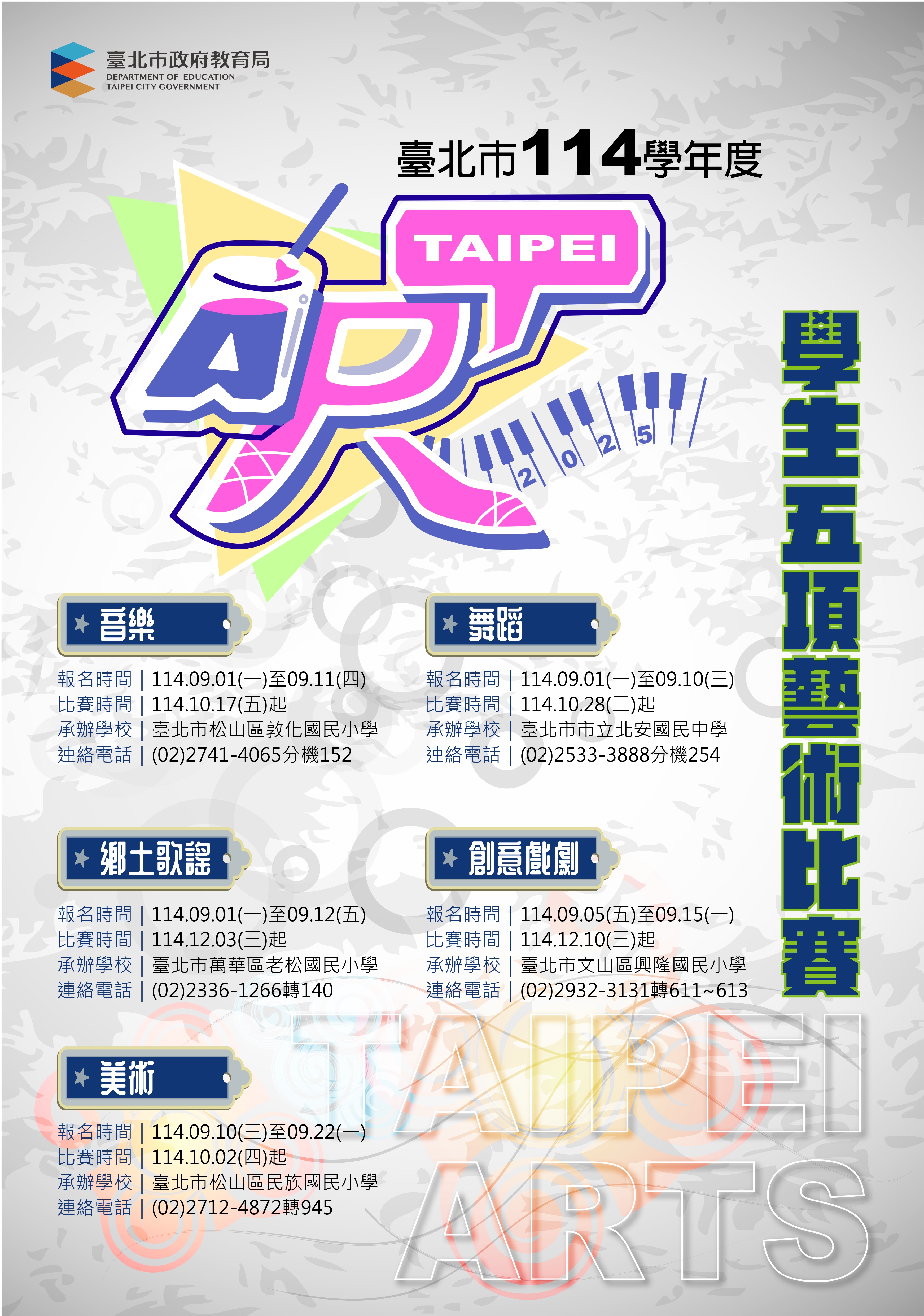 三、比賽日期:確定日期及賽程將於114年9月26日(星期五)公告於臺北市五項藝術比賽網站。