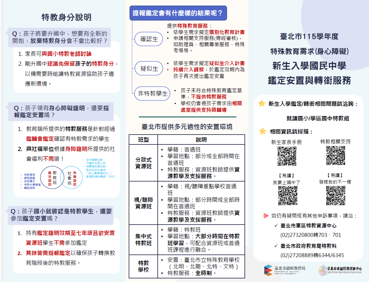 五、家長手冊及宣導三折頁電子檔,可於 114年10月22日(三) 下午6時後,於【東區特教資源中心網站】─【鑑定安置】 ─【新生家長手冊】下載