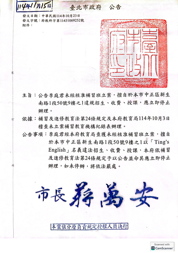 二、「Ting's English」(負責人:李庭)經本局查獲未經核 准補習班立案,