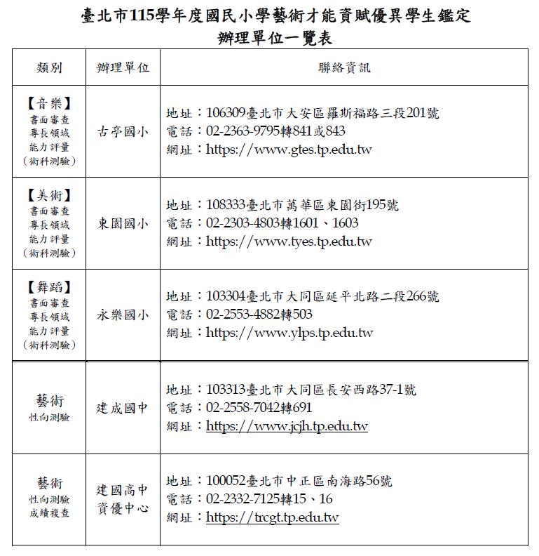 一、臺北市115學年度國民小學藝術才能資賦優異學生鑑定計畫詳如附件。二、倘有國小藝術才能資優鑑定相關疑問,請逕洽115學年度承辦單位,詳如下方表格。