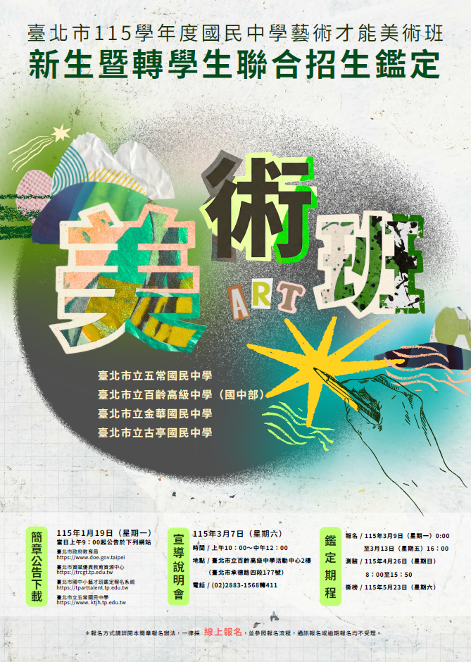 ☆☆ 美術班招生宣導說明會訂於115年3月7日(星期六)上午10時假 臺北市立百齡高級中學 活動中心 2樓 辦理。
