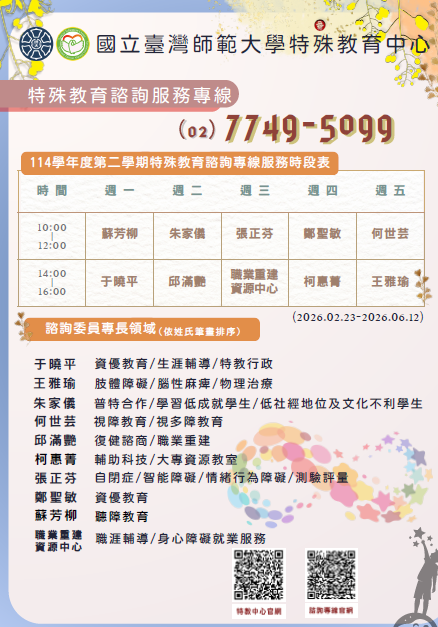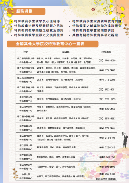 二、該中心提供特殊教育諮詢服務(02-7749-5099),本學期服務時間為週一至週五上午10時至12時、下午2時至4時。