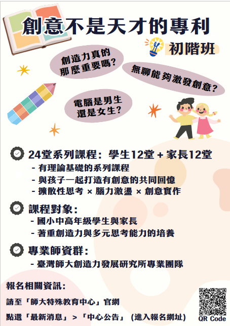 一、為促進國小學生創意思考能力與親子互動學習,本校特殊教育中心潛能開發中心辦理「114學年度第二學期推廣課程-國小組《創意不是天才的專利》」。