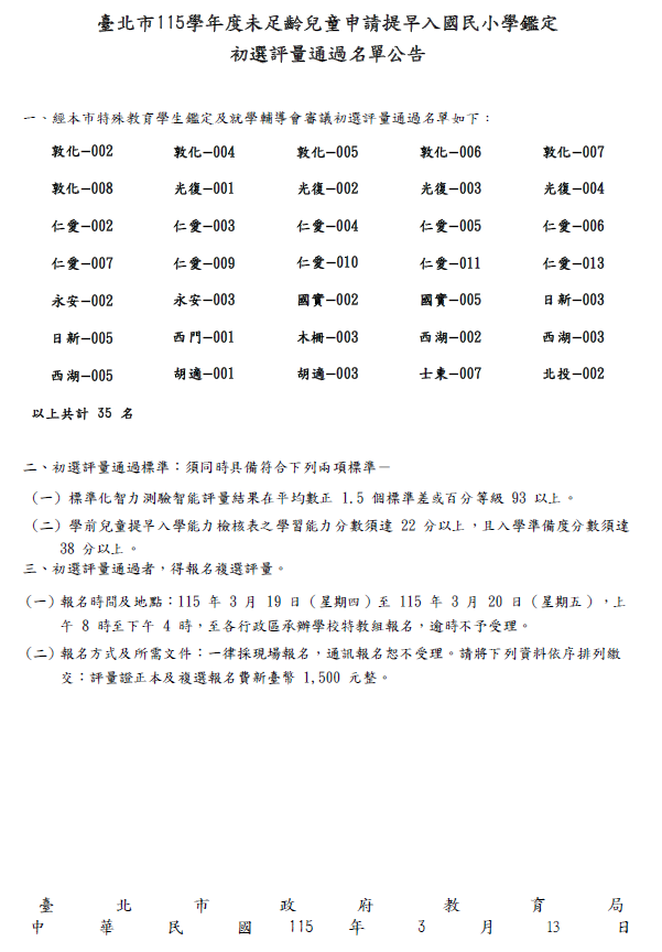 家長可至「臺北市未足齡兒童申請提早入國民小學鑑定安置系統」(https://early.tp.edu.tw/)查詢成績,相關操作方式及流程,詳見【學前提早入學-初選成績查詢操作說明】(如附件)
