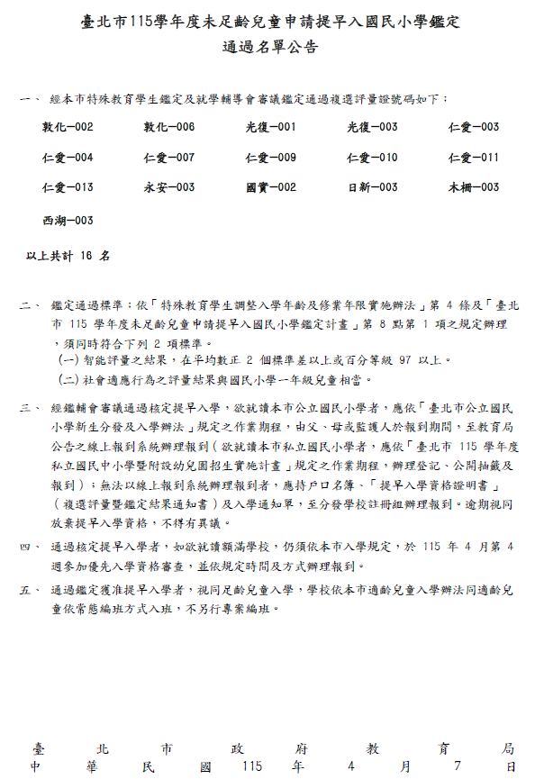 家長可至「臺北市未足齡兒童申請提早入國民小學鑑定安置系統」( https://early.tp.edu.tw/ tw/)查詢成績,相關操作方式及流程,詳見 【學前提早入學複選成績查詢操作說明】(如附件)。